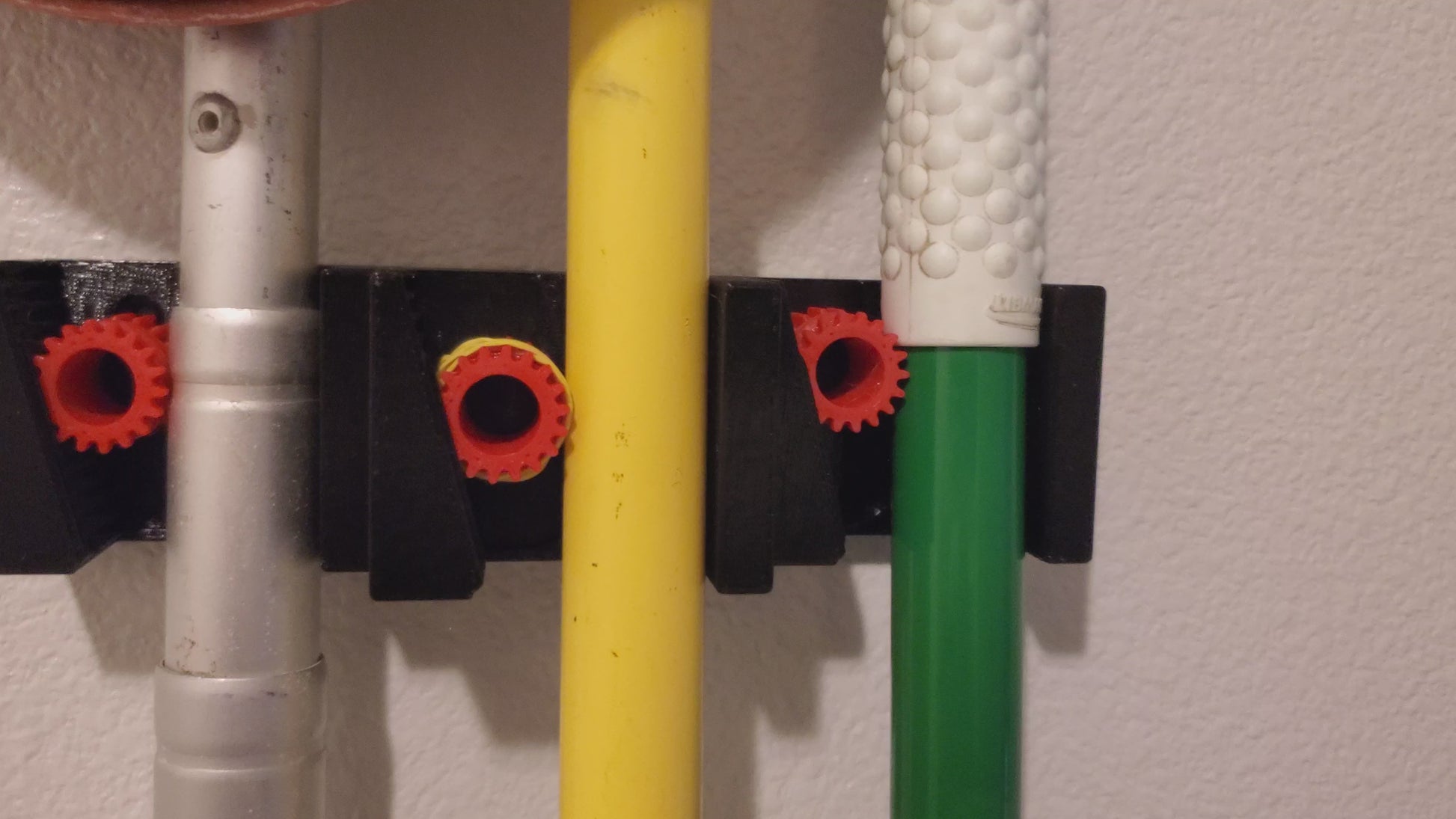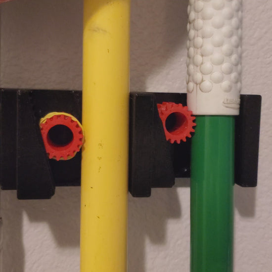 This gravity-assisted broom holder uses a rolling gear and the broom's own weight to securely clamp it in place. This can also hold any cleaning supply or tool with the same stick-style design as a broom. Organizing cleaning supplies has never been easier. Some metal handled items can be a little too slippery for the gear to grab onto, Placing a rubber band on the gear as pictured will solve any gripping issues.